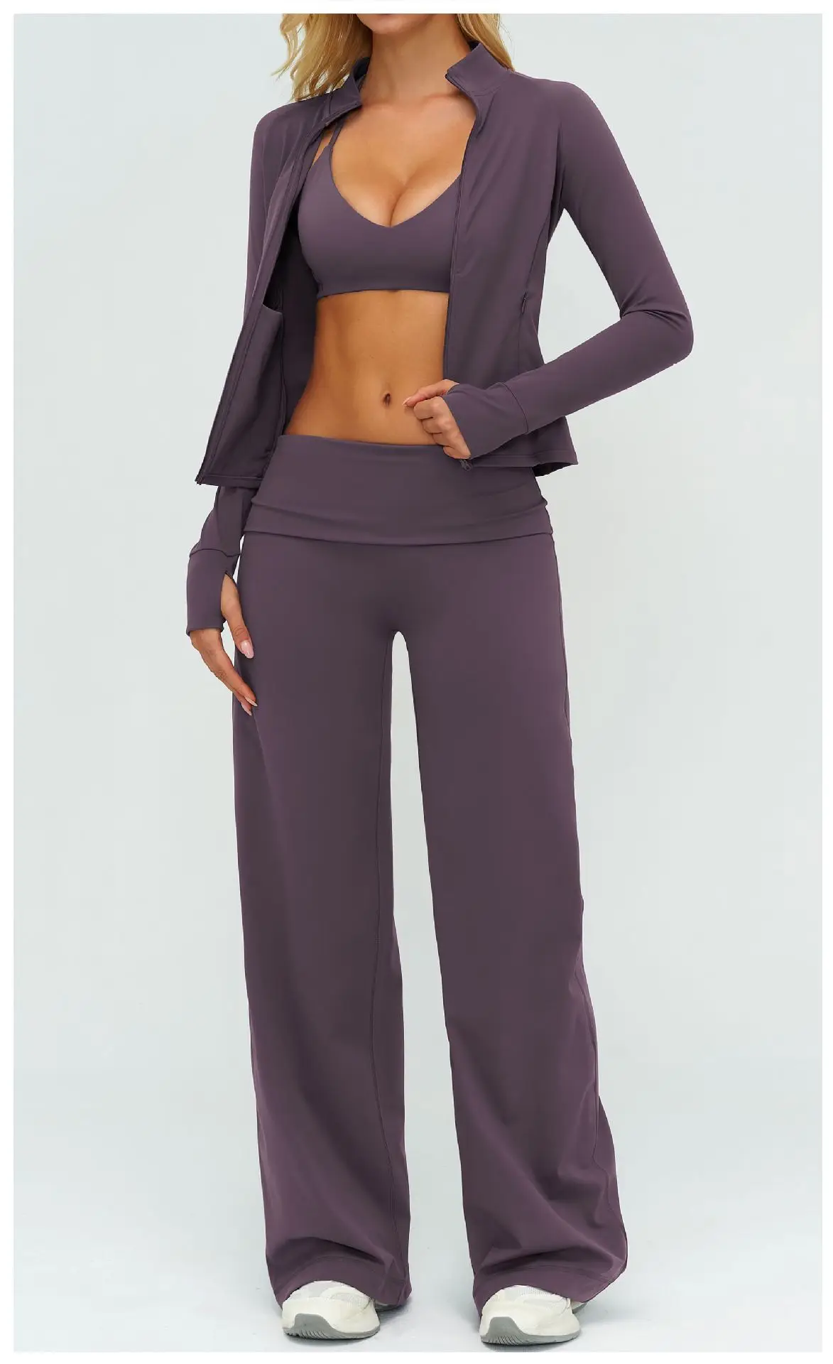 Women Fitness Sports Clothes Long Sleeve Tight Jacket 4 Pieces Set Backless Halter Workout Flared Leggings Set